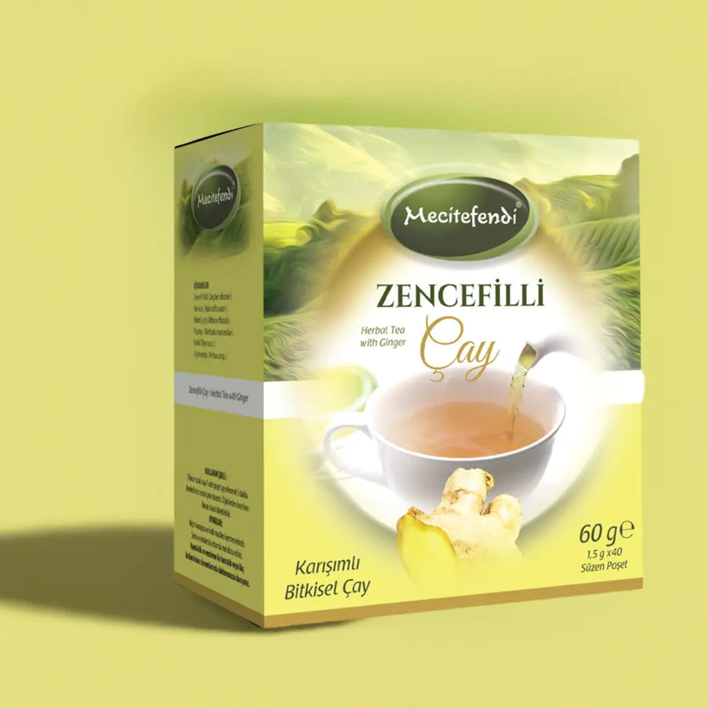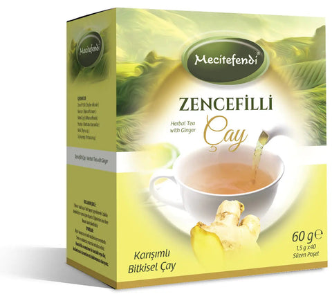 Highlights✓ 40 Teabags✓ Naturally caffeine-free✓ Herbal blend with ginger✓ Pleasant herbal aroma and taste Product DetailGinger Tea, a specially formulated premium quality herb, is a herbal blended tea (mainly Ginger) with a special formulation produced in Mecitefendi facilities within the scope of food safety. Plants used before the production of Ginger Tea, which does not contain any additives, were sterilized by dry sterilization technique.IngredientsGinger, Lesser Galangal, Marshmallow flowers, Camomile, Thyme, Mullein.Introduction of UsePut 1 tea bag in the cup, add boiled drinking water over it. After waiting 5 minutes, it is ready to drink.Store in a cool and dry place. Do not expose to direct sunlight.